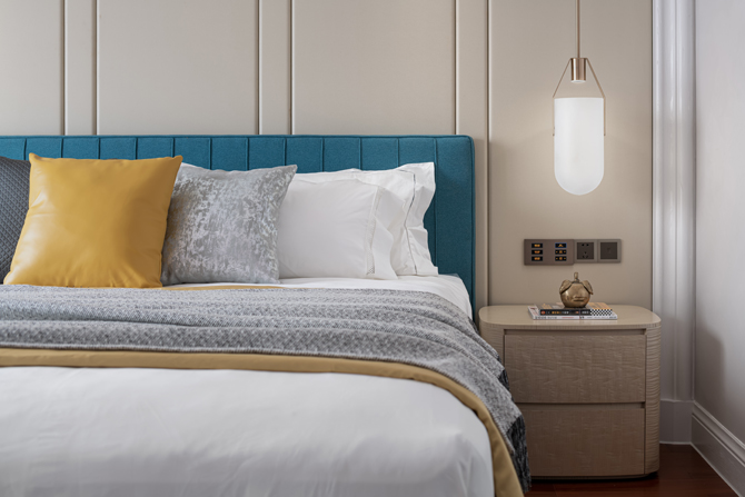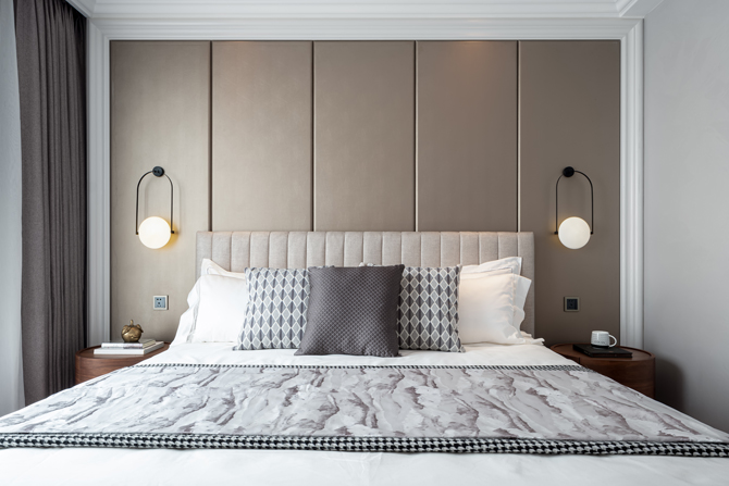 长辈房用色沉稳朴质,米色柔和,灰色大气,勾勒舒适尊享的氛围,现代简约形制壁灯造型精巧,暖色光晕烘托起温馨有爱的生活场景。