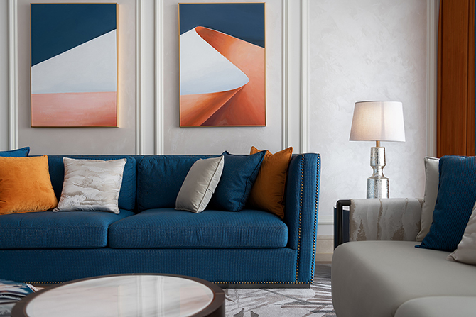 我们尝试以鲜明热烈的色彩与臻选的材质碰撞出全新的空间调性,宝蓝的华美邂逅明快的落日橙,轻奢个性、温暖雅致,让每一个场景生动而鲜活,仿若色彩研想室,让身处其中的人都能感受到色彩所传递的精神与力量。
