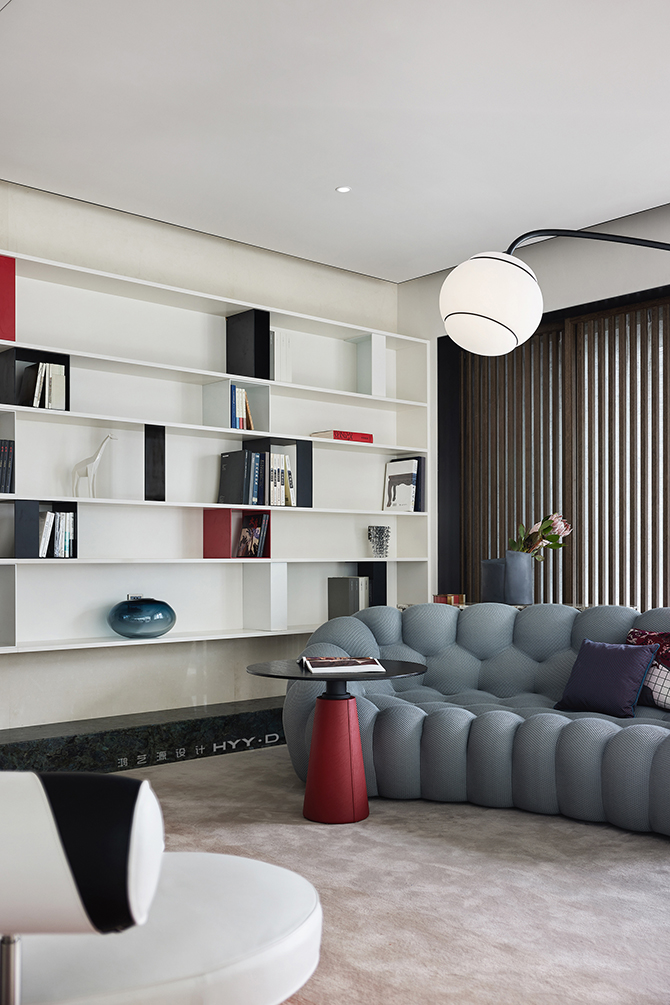 主卧延续玄关空间的艺术线索,床头墙面白色群鱼自在畅游,红色装饰柜一圈泛起的涟漪将思绪拉进自然的呼吸中,再次强化了如鱼得水的灵感设想。作为一个私享的休息空间,一部会心的电影,一次深入的畅谈,生活的浪漫情调都会生发于此,余韵悠长。