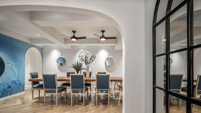 状如海洋乐园的手绘墙与鱼缸的组合牵引出清新气息,虚实相生,耳畔仿佛有海风拂过,就餐时的轻松童趣氛围呼之欲出。