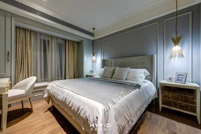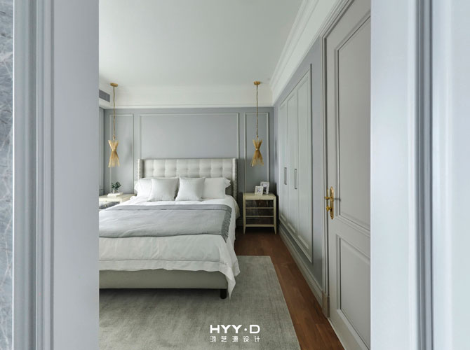 主卧 / Master bedroom,家具曼妙的形态和稳重的色彩具有典雅感,暗藏式的收纳设计让空间更井井有条,舒适在前,奢华在后。