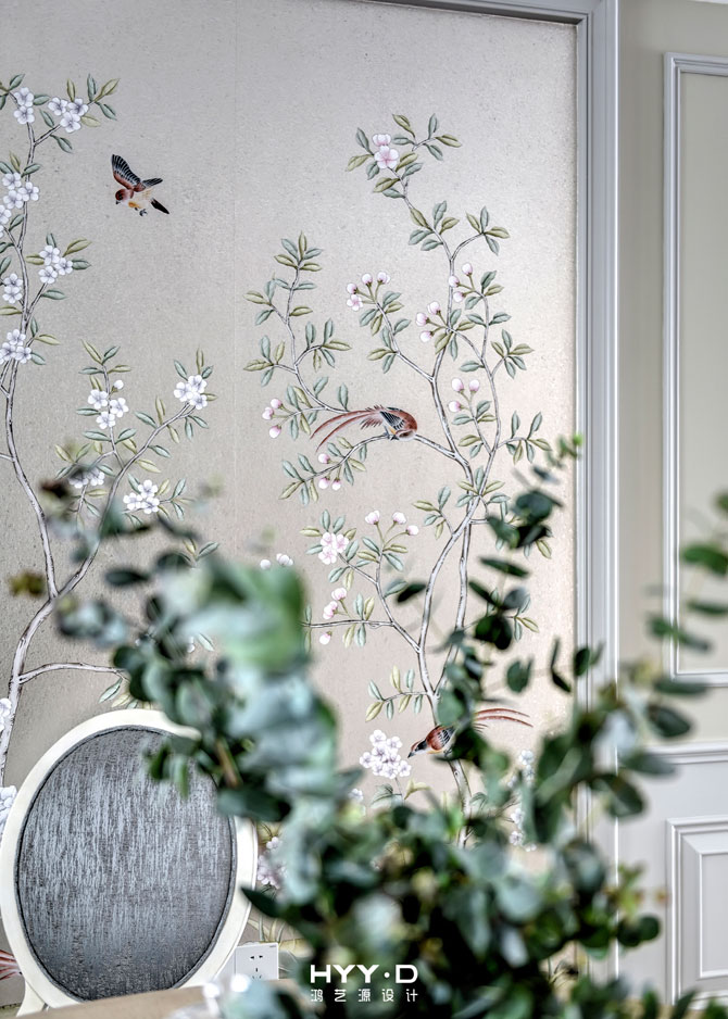 餐厅局部,东方韵味的花鸟手绘饰面,经过它时,能捕捉到花朵中闪烁的零星光辉,为餐厅一角引进鸟语花香。