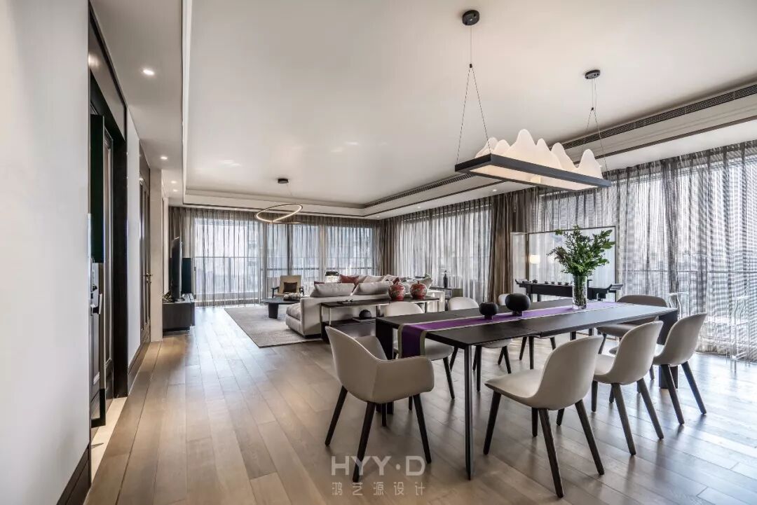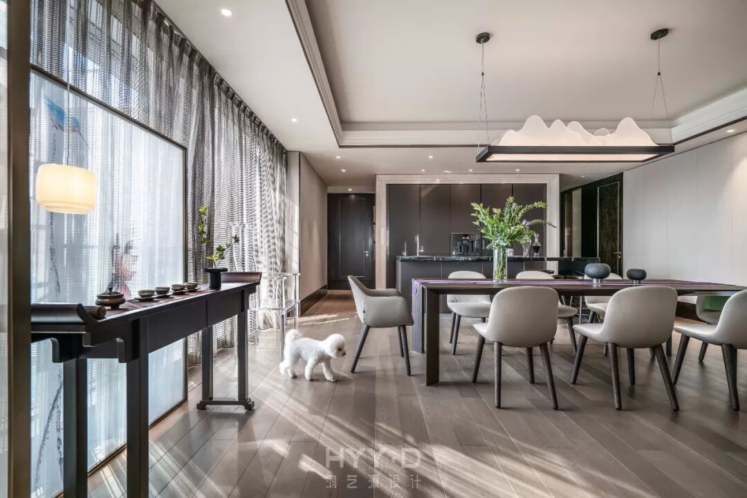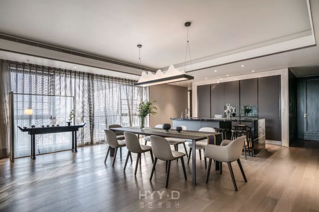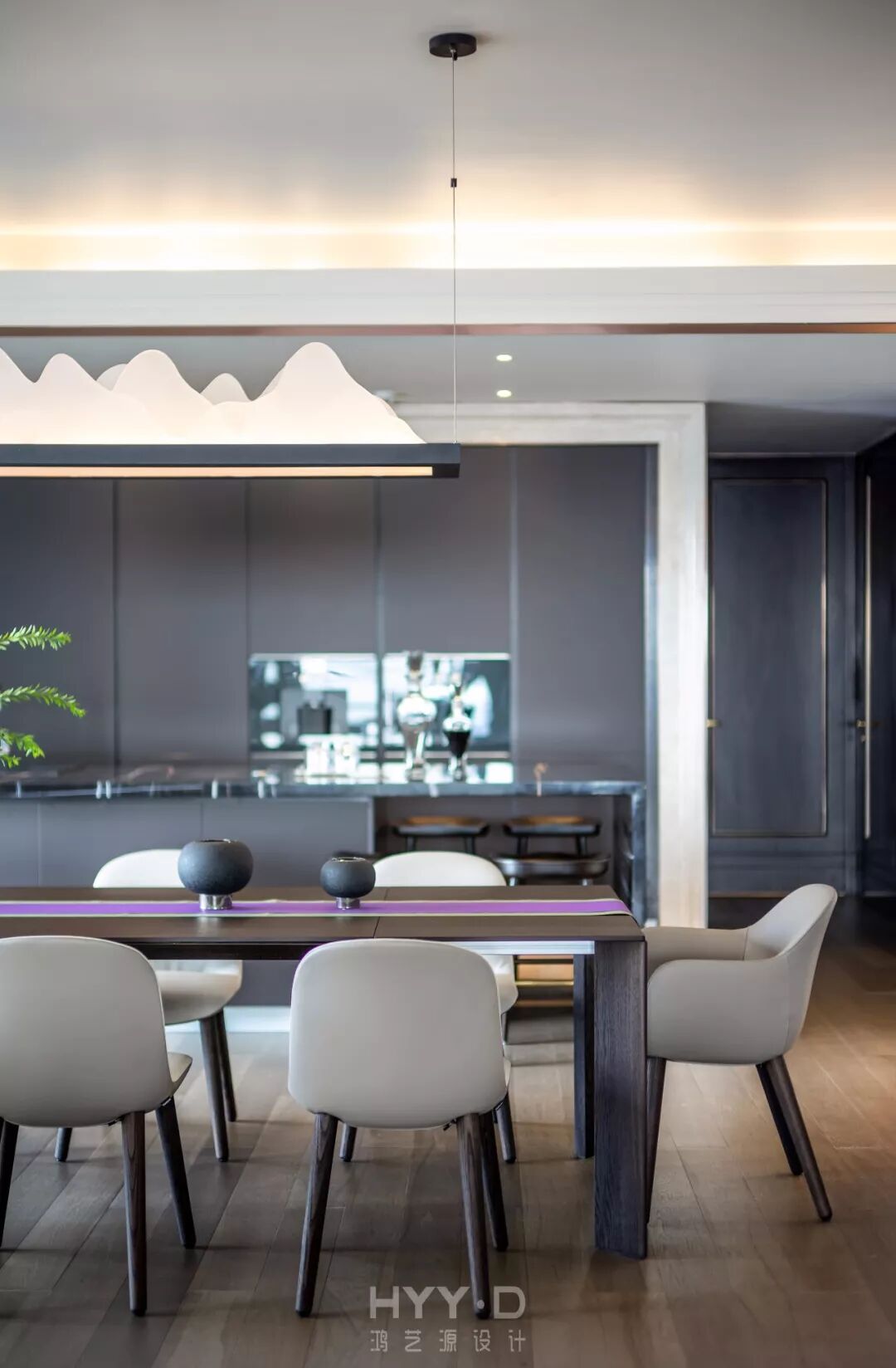 餐厅延续会客厅空间的基调,臻选意大利 Poliform 餐桌椅,精致的亚克力山水造型灯饰,以简单的形制礼遇生活之美。