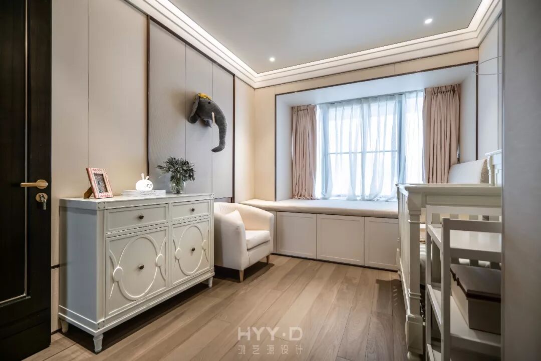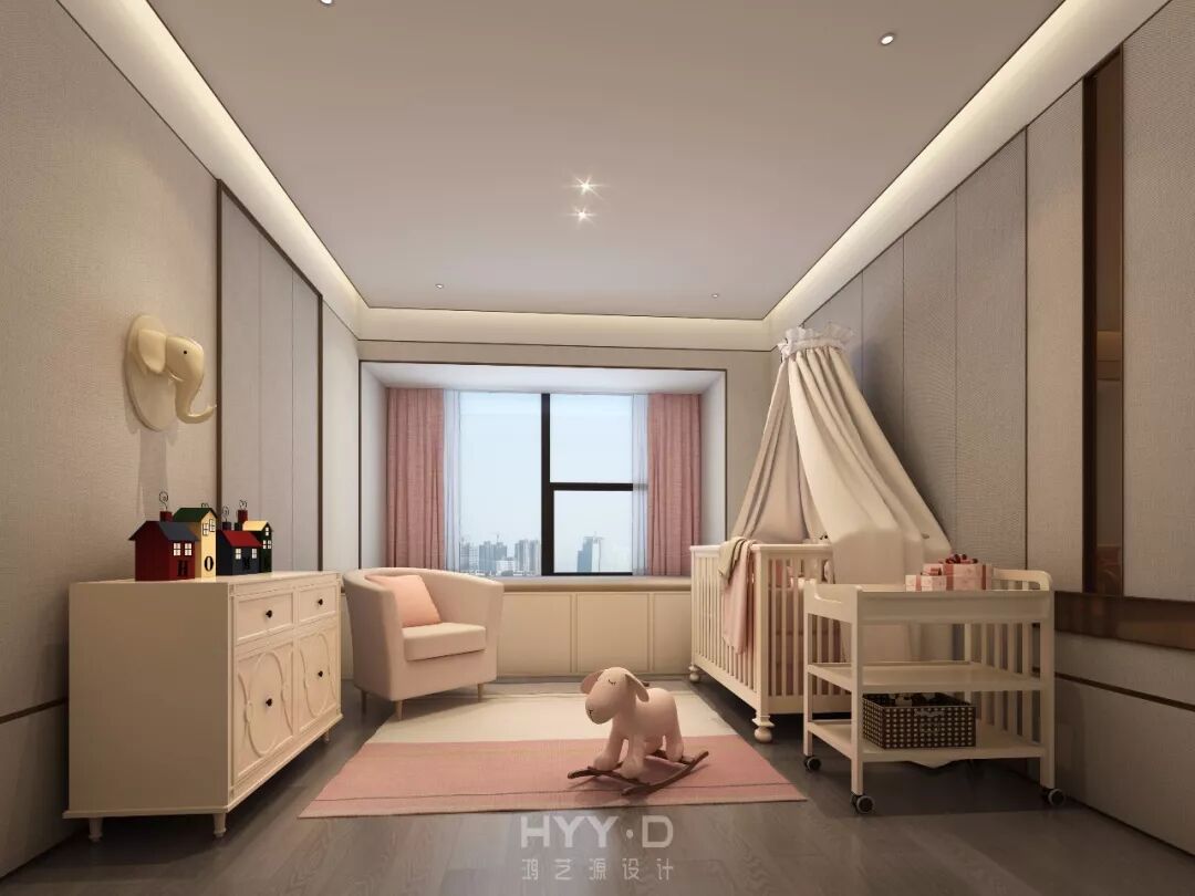 两间婴儿房以淡粉与水蓝作为区隔,配备成对的婴儿床、衣橱,还有一件件童趣别致的玩具。在设计中,鸿艺源设计贯穿着对未来生活的考虑,为居住空间留有成长与进化的可能。婴儿房及儿童娱乐室均在背景墙的设计上做了预留手法,随着孩童的成长,家长只需将家具进行替换,无须进行二次装修。