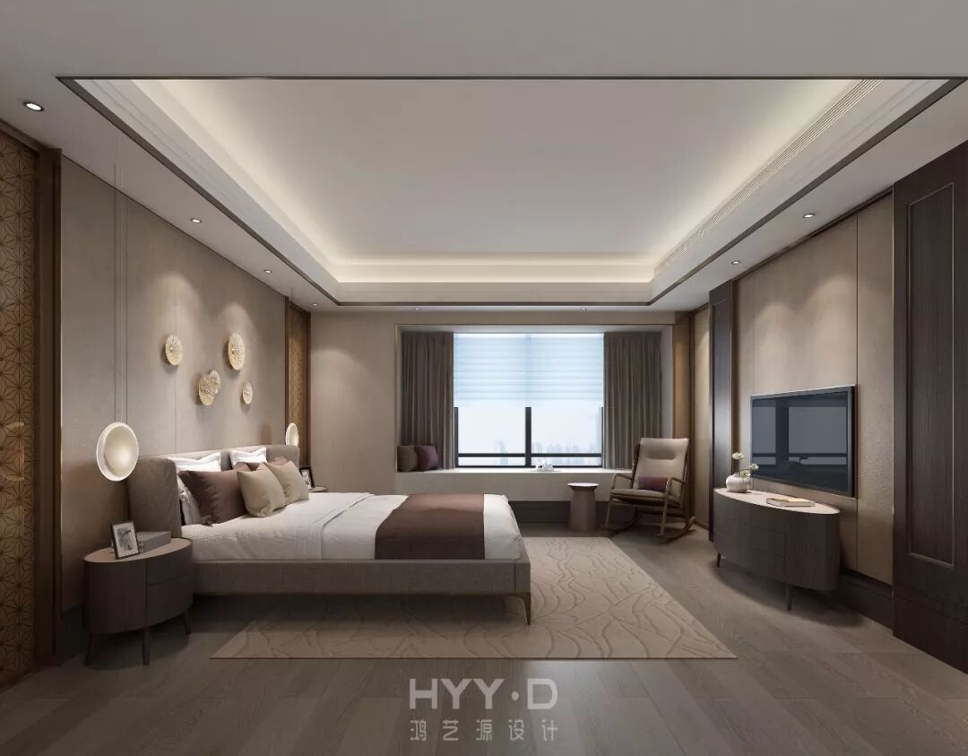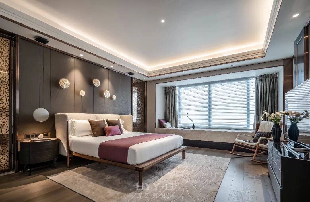 主卧无主灯设计,而是将灯光收纳于吊顶内,使室内显得更为柔和安适。设计将真正的尊享藏于每个细节,精细打磨的墙面与木制地板、细腻柔软的暖棕色床品,通过材质的光感隐透简净高雅的质感美学。