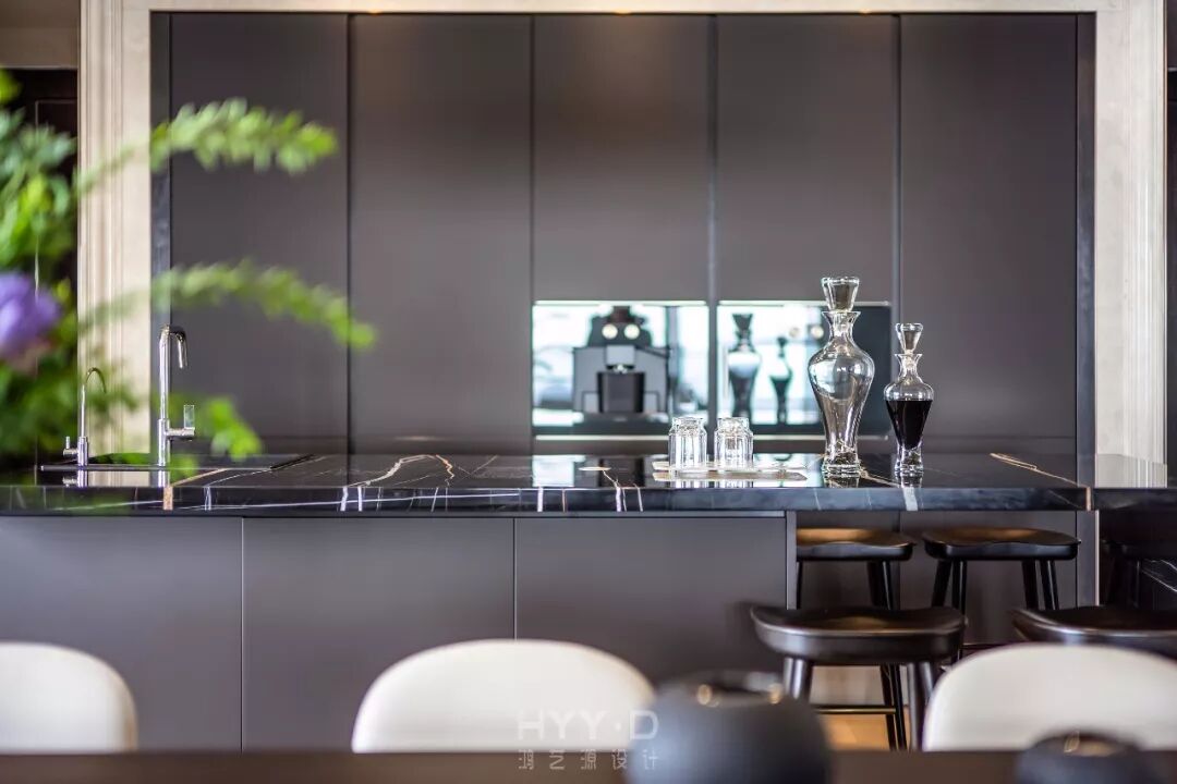 西厨岛台采用大理石与木材无缝贴合,睿智的黑在空间中焕发着张力,突出设计臻选的态度与品质的精尚。