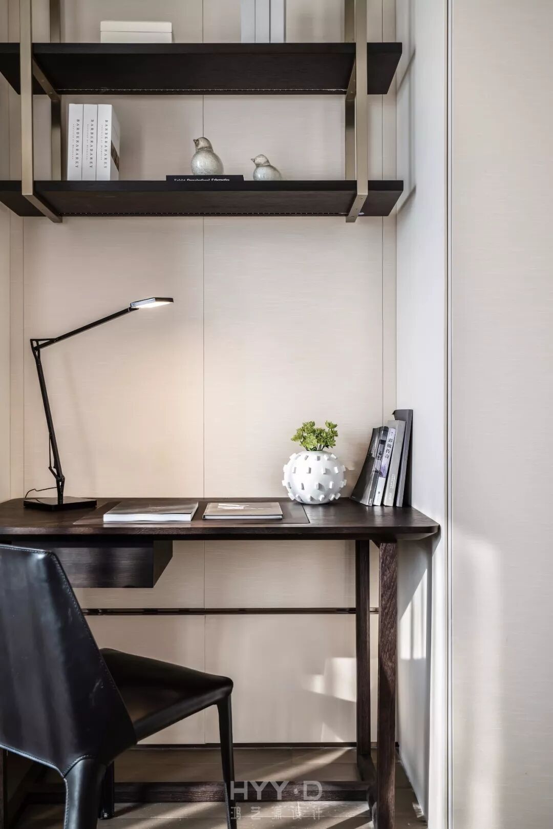约64㎡的通透主卧套房设计,以三进的方式将书房、卧室、主卫进行构设,使空间具备更好的秩序感与私密性。书房以简净的黑白色调对话,现代极简语汇与中式情韵在空间中相融相生,分外静雅。飘窗区被设计为茶室,原木、清茶、松叶、花卉交汇在一起,清甜而微香。晨间的日光柔和,夜晚的月色明澈,一杯清茶,共待流年。